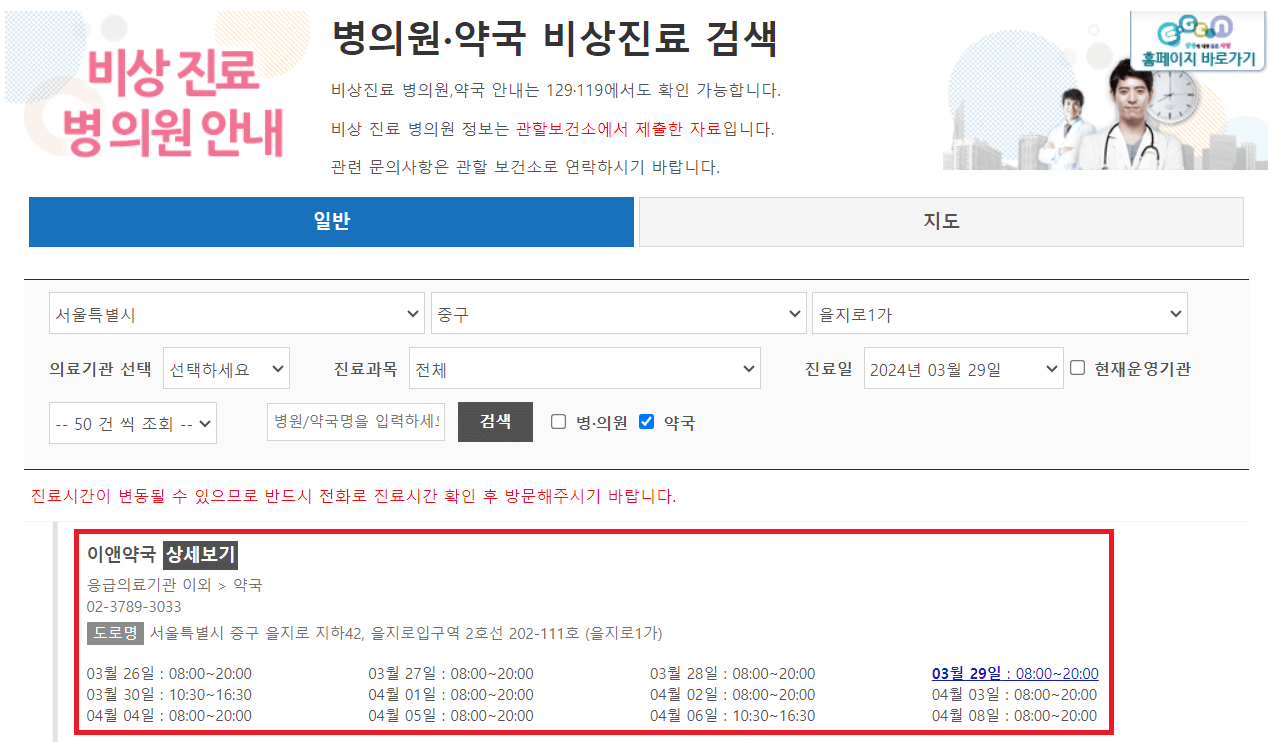 ③ 영업중인 약국과 영업시간을 확인 후 방문하시면 됩니다.