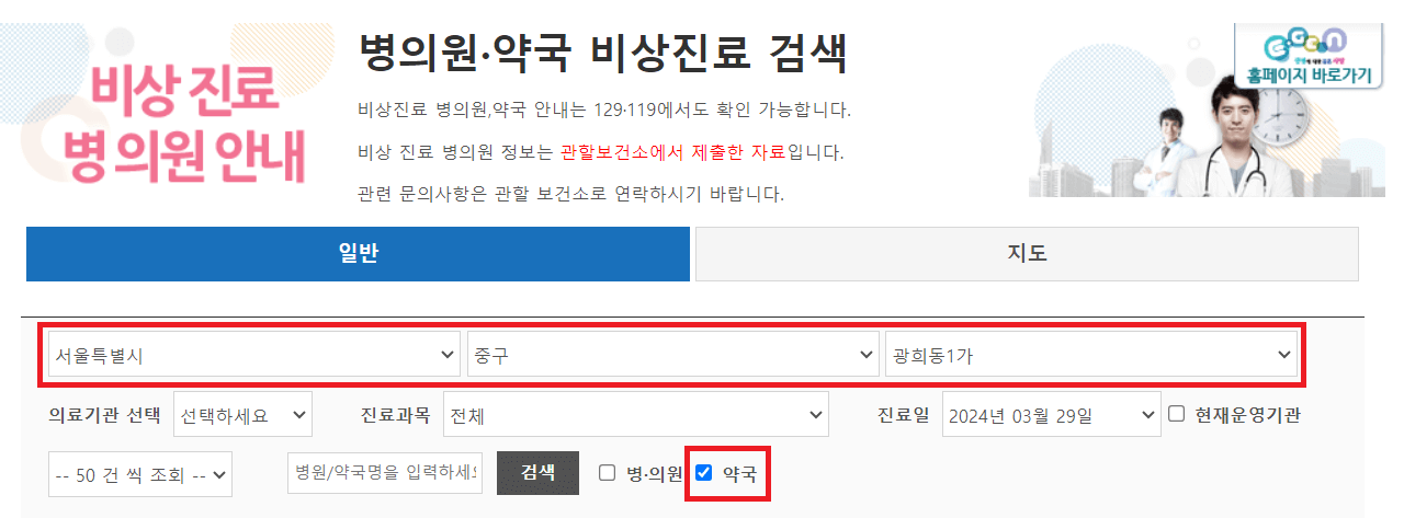 보건복지콜센터, 119구급상황관리센터 약국 찾기