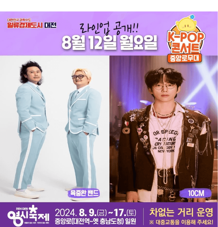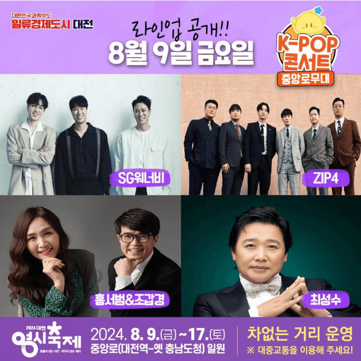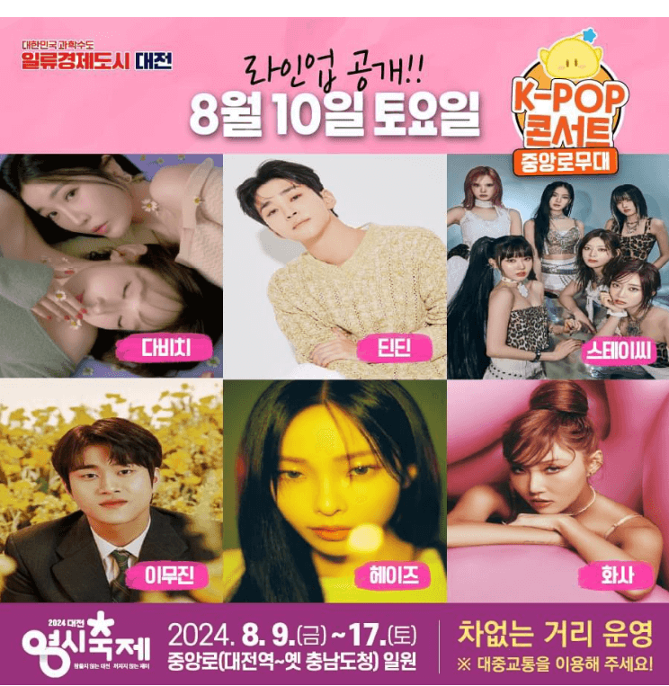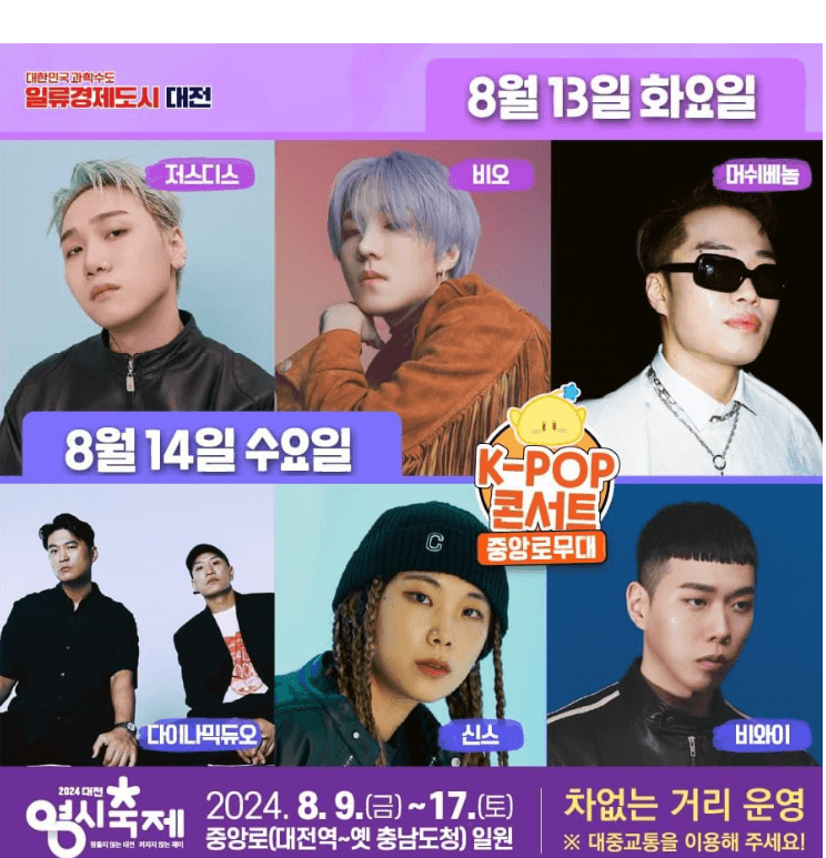 "개척자들의 도시, 일류 관광도시 대전을 즐기다!"를 주제로 대전 0시축제가 8월 9일(금)부터 8월 17일(토)까지 대전역, 중앙로 및 옛충남도청 인근에서 진행 중 입니다. 2024년 대전 0시 축제에서 가장 집중받는 하이라이트는 바로 K-POP 가수 공연입니다. 일자별 K-POP가수 라인업 및 장소를 바로 확인해보세요.