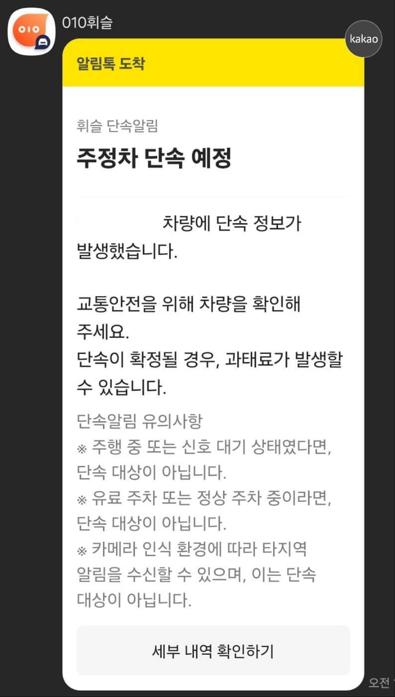 주정차 후 단속에 잡히게 되면 아래와 같이 알림톡이 발송됩니다. 알림을 받은 즉시 차량을 이동하시면 주정차로 인한 과태료가 부과되지 않습니다. 만약 이러한 알림설정을 해놓지 않는다면 주정차 단속에 무방비로 노출될 수 밖에 없으니 5분정도의 시간을 내서 바로 설치 및 알림설정까지 완료하세요.