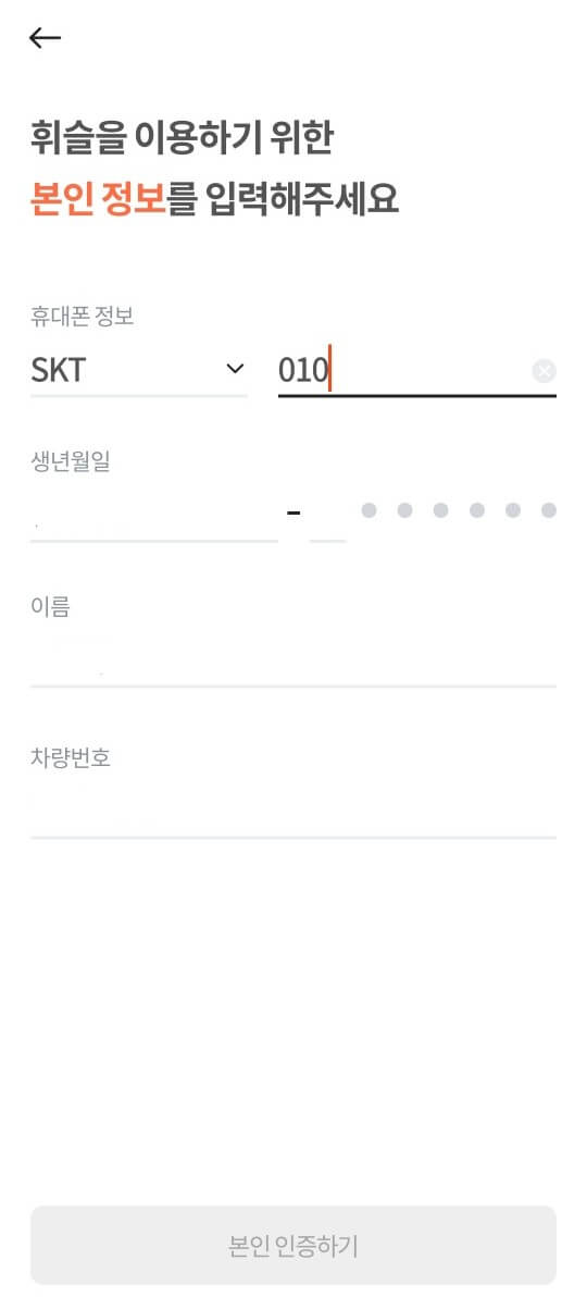 2️⃣ 차량번호, 이름, 생년월일, 휴대폰정보 순으로 입력합니다.