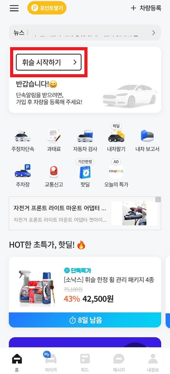 1️⃣ 구글 플레이 스토어 또는 애플 앱스토어에서 "휘슬"앱을 설치합니다. 설치 후 메인 페이지에서 "휘슬 시작하기"를 선택합니다.