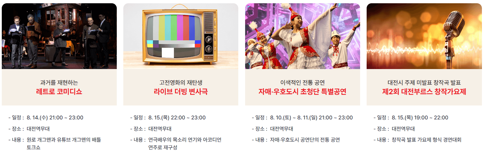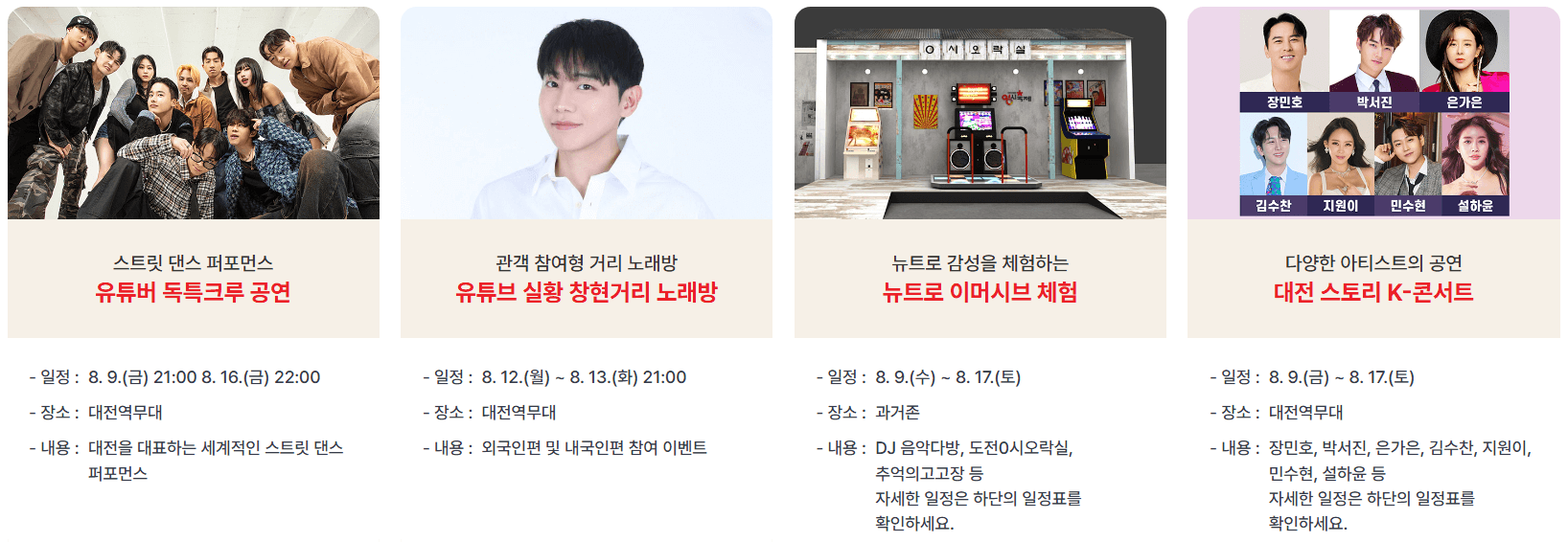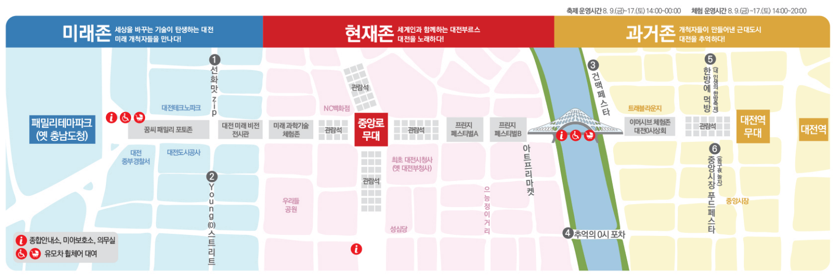 2024년 대전0시축제가 8월 9일부터 17일까지 대전역에서 옛 충남도청까지 중앙로 인근에서 진행중에 있습니다. K-POP 콘서트를 포함하여 다채로운 행사가 진행되고 있습니다. 행사장별로 과거, 현재, 미래의 주제로 행사가 진행되고 있으니 "존"별로 일정을 확인하여 알찬 축제를 보내세요.